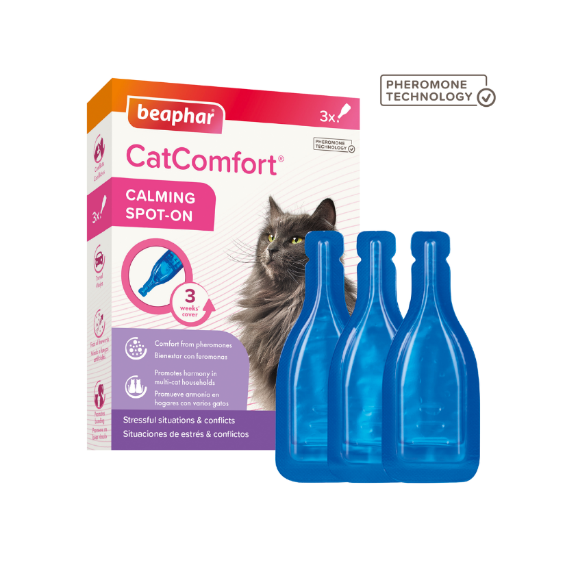Las Pipetas Beaphar CatComfort® son una solución sencilla y eficaz para reducir los problemas de comportamiento de los gatos, como los maullidos excesivos, el comportamiento agresivo, las peleas, la evitación, el ocultamiento o la sensación general de ansiedad. Son especialmente beneficiosas cuando los gatos se enfrentan a nuevas experiencias, como hogares con varios gatos, situaciones sociales, una nueva familia y periodos de aprendizaje. Las Pipetas Beaphar CatComfort® contienen una copia de la feromona apaciguadora materna producida de forma natural, que los gatos reconocen al instante.