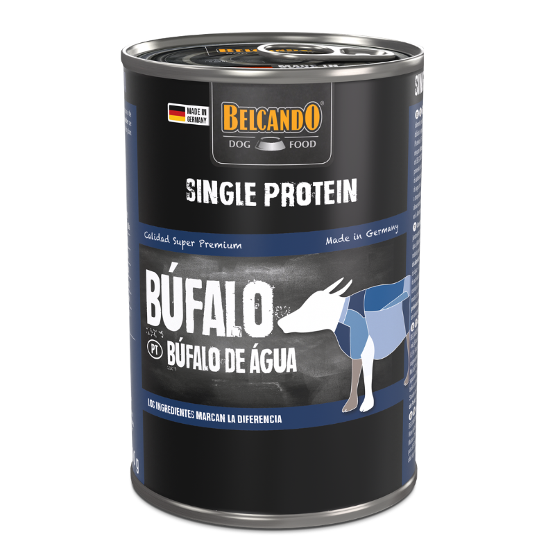 BELCANDO Single Protein Búfalo es una carne enlatada pura y de alta calidad, con búfalo como única fuente de proteína y totalmente libre de aditivos. En combinación con un complemento alimenticio como BELCANDO Mix it GF, constituye la fuente de proteína ideal para dietas de eliminación, con las cuales puede identificar a qué tipos de carne puede ser sensible su perro. Las variedades Single Protein también pueden utilizarse para una alimentación prolongada en casos de intolerancia alimentaria – siempre en combinación con BELCANDO Mix it GF.