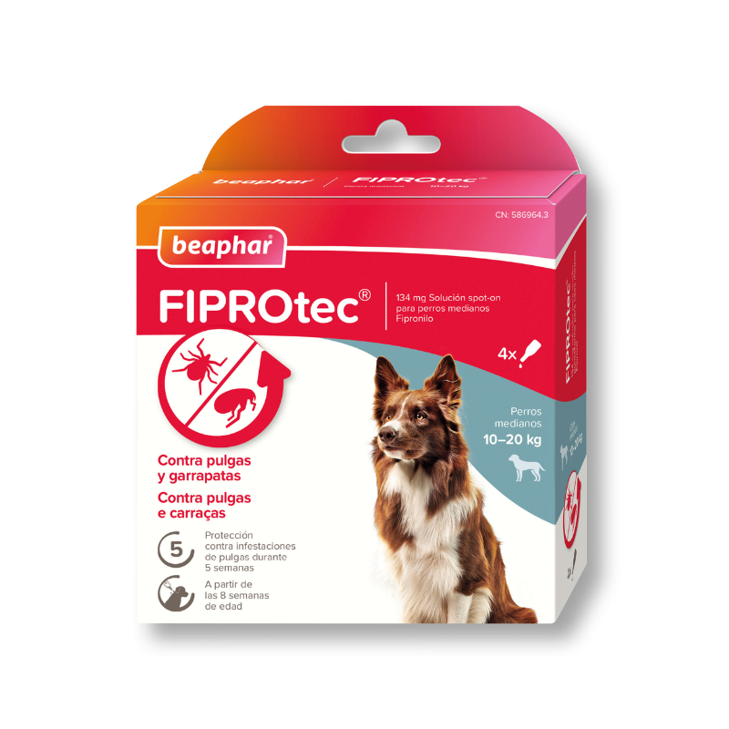 Beaphar FIPROtec® es la solución experta en formato pipeta para el tratamiento y prevención de las infestaciones de pulgas y garrapatas, ya que una pipeta elimina y protege a tu perro durante 5 semanas contra las pulgas y 4 semanas contra las garrapatas. El fipronilo actúa bloqueando el principal neuroregulador del sistema nervioso central de estos parásitos, provocando su muerte en 24 horas en el caso de las pulgas y en 48 horas en el caso de las garrapatas. Elimina los parásitos por contacto, lo que también contribuye a prevenir la dermatitis alérgica provocada por la picadura de pulgas. Está indicado para perros a partir de 8 semanas de edad y con un peso de entre 20 y 40 kg.