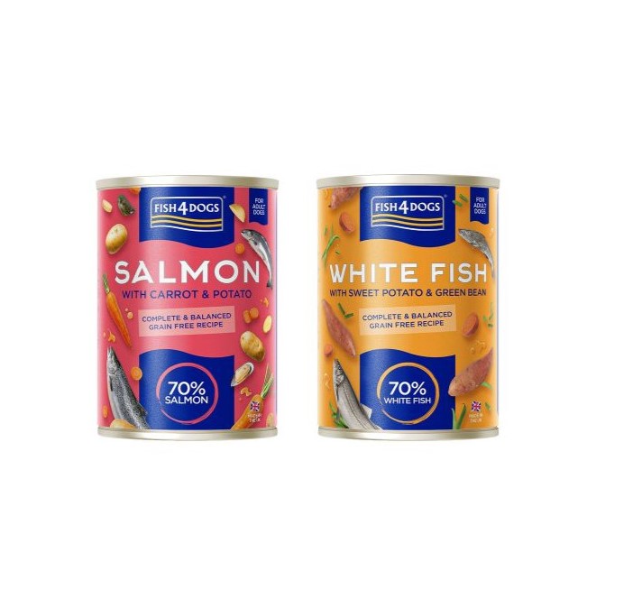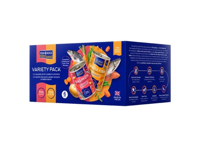 Fish4Dogs multipack contiene 6 latas de 395 gr , 3 del sabor pescado blanco con boniato y 3 de salmón con zanahoria, deliciosas recetas para perros adultos.