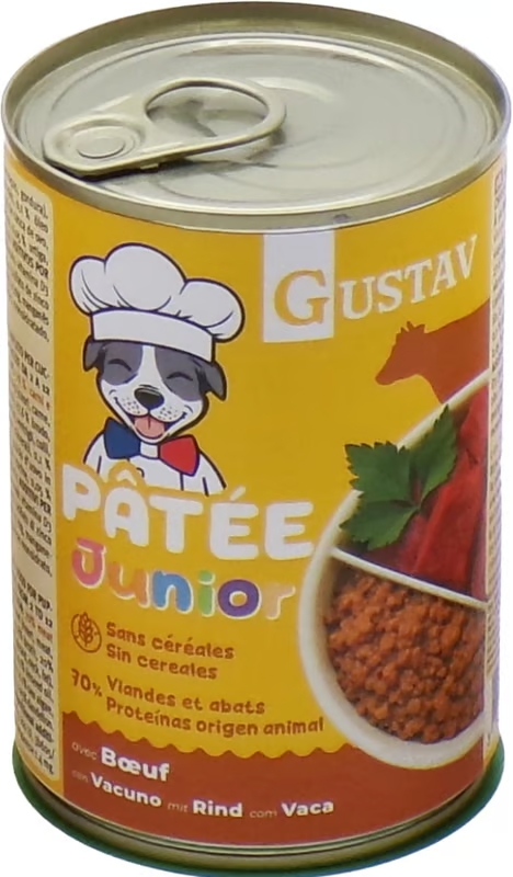 Elegir GUSTAV Comida húmeda de Ternera para cachorro es optar por una marca que apuesta por la sencillez, el sabor y el bienestar digestivo. GUSTAV ofrece recetas completas, aquí presentadas en una lata práctica con un diseño claro y un enfoque pensado para perros jóvenes. Este planteamiento permite ofrecer una comida húmeda para perro apetitosa, tranquilizadora y adaptada a las necesidades específicas de los cachorros. Con su alto contenido en productos de origen animal, esta gama garantiza una comida sabrosa, equilibrada y fácil de integrar en los hábitos diarios de tu mascota.