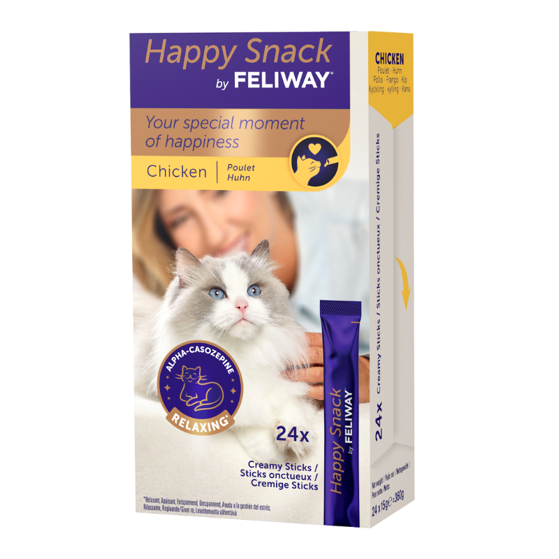 Diseñado para ayudar a que los gatos gestionen mejor los momentos de estrés. Es ideal ayudar a los gatos que salen al exterior, en viajes y visitas al veterinario o incluso como corrector en la consulta. Gracias a su textura cremosa se puede dar directamente desde el sobre, junto con su comida o incluso en el dedo. Es apto tanto para gatos como para gatitos (a partir de 12 semanas). Permite crear un hábito relajante y ayuda a reforzar el vínculo humano-animal. El gato es un animal que disfruta con la rutina y que se siente más feliz cuando experimenta rituales positivos, como el que se crea con Happy Snack by FELIWAY®.